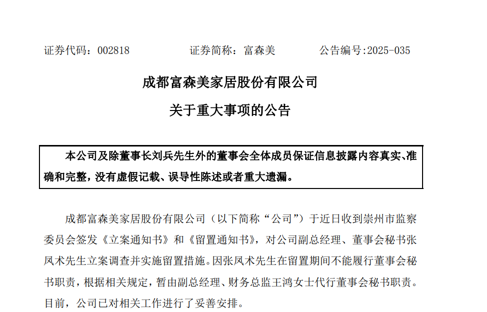 11月25日,富森美(002818.SZ)发布公告,公司收到崇州市监察委员会签发《立案通知书》和《留置通知书》,对公司副总经理、董事会秘书张凤术立案调查并实施留置措施。