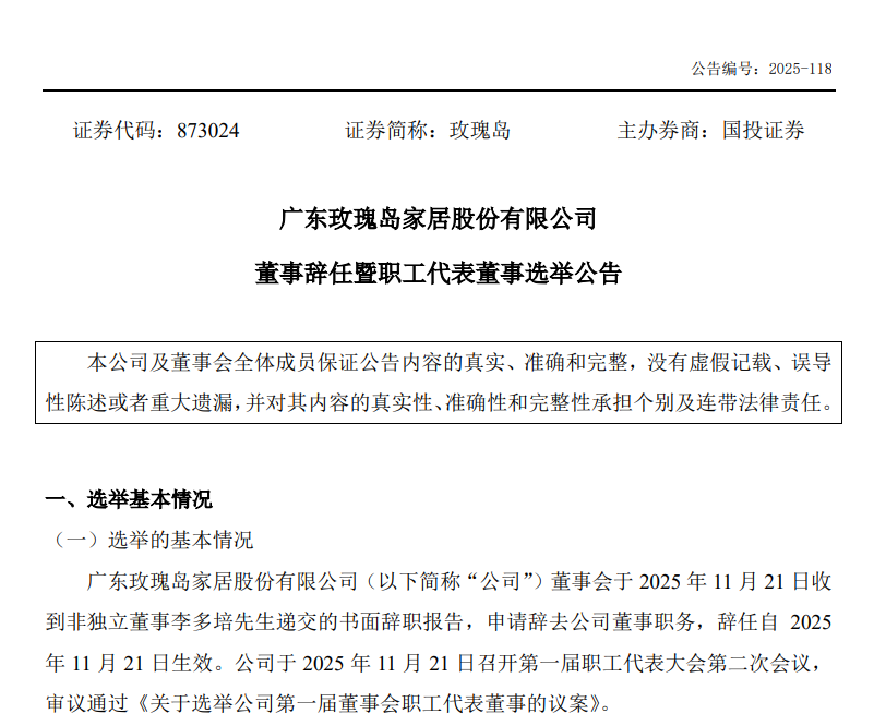 11月25日,玫瑰岛(873024.NQ)发布公告,公司收到非独立董事李多培递交的书面辞职报告,申请辞去公司董事职务。同时,经职工代表民主选举,选举李多培为公司职工代表董事。