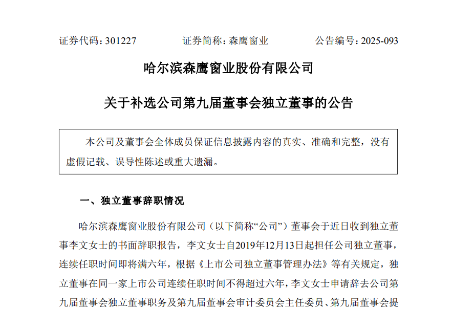 11月24日,森鹰窗业(301227.SZ)发布公告,经公司第九届董事会提名委员会资格审查,董事会提名李沐瑶为公司第九届董事会独立董事候选人,并在股东会选举通过后一并担任公司第九届董事会审计委员会主任委员、第九届董事会提名委员会委员职务。