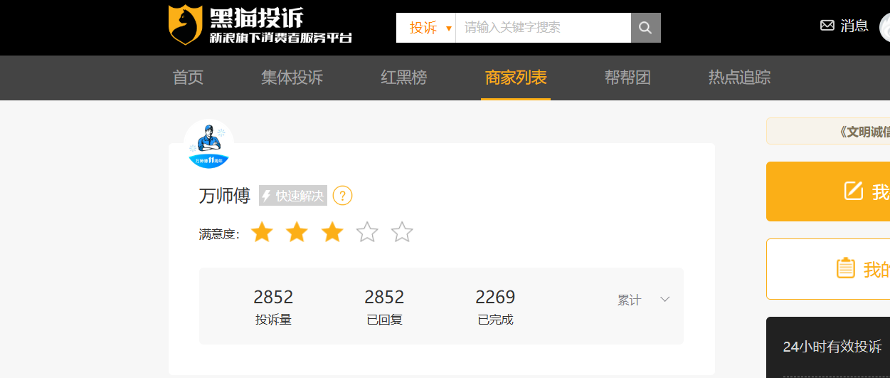 据黑猫投诉平台显示,万师傅累计投诉达2852条,已完成2269条。近一个月投诉量达122条。
