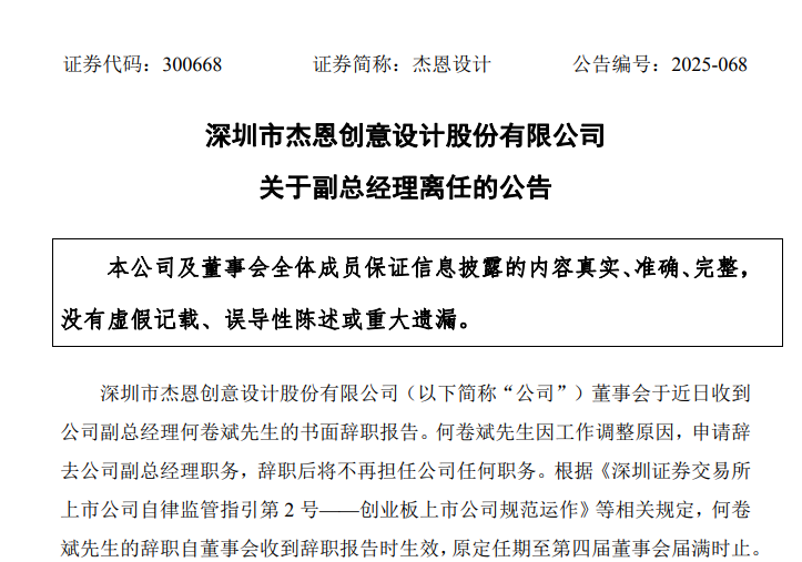 11月24日,杰恩设计(300668.SZ)发布公告,何卷斌因工作调整原因,申请辞去公司副总经理职务,辞职后将不再担任公司任何职务。