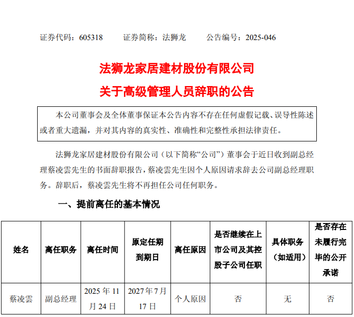11月24日,法狮龙(605318.SH)发布公告,蔡凌雲因个人原因请求辞去公司副总经理职务。辞职后,蔡凌雲将不再担任公司任何职务。