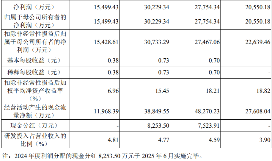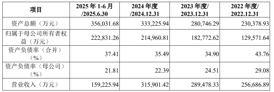 业绩方面,2022年至2024年及2025年上半年(报告期内),皇冠新材的营业收入分别为25.67亿元、28.95亿元、31.59亿元和15.92亿元,归属于母公司所有者的净利润分别为2.06亿元、2.78亿元、3.02亿元和1.55亿元。