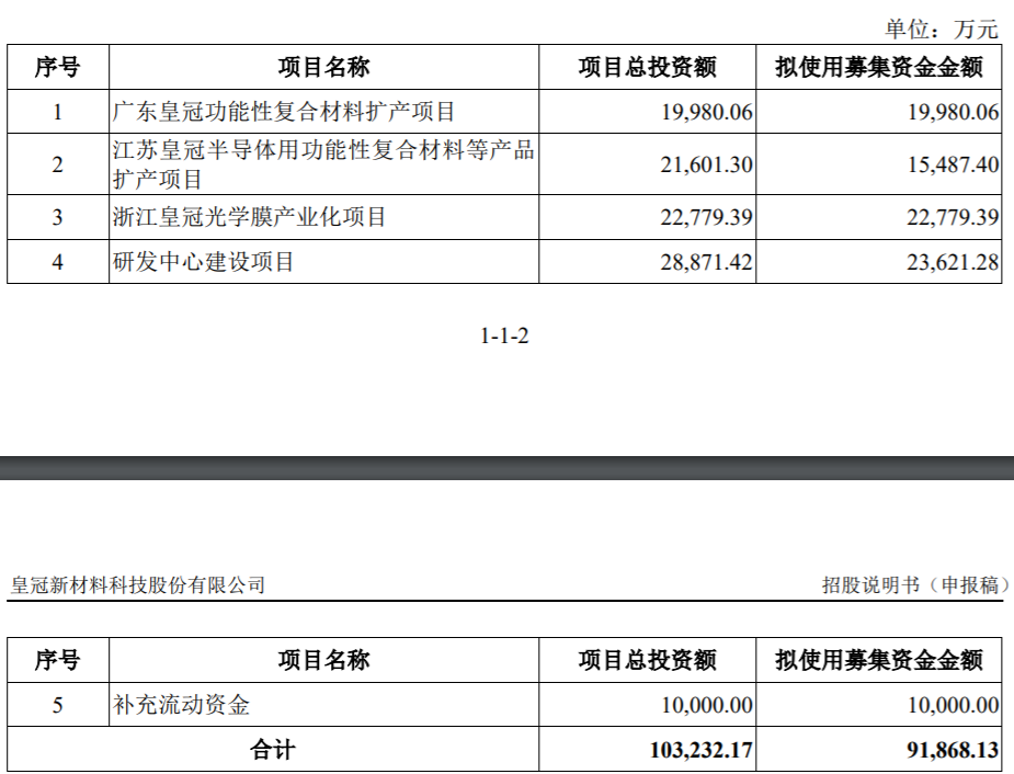 本次IPO,皇冠新材拟使用募集资金金额9.2亿元,分别用于广东皇冠功能性复合材料扩产项目、江苏皇冠半导体用功能性复合材料等产品扩产项目、浙江皇冠光学膜产业化项目、研发中心建设项目及补充流动资金。
