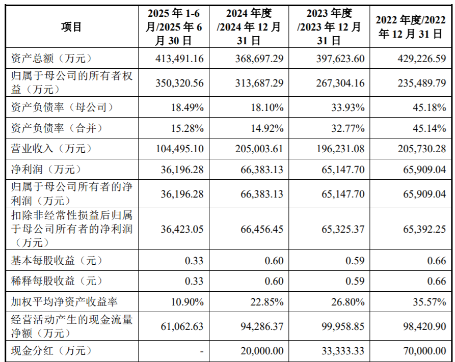 2022年至2024年及2025年上半年,马矿股份实现营业收入分别为20.57亿元、19.62亿元、20.50亿元和10.45亿元,实现归属于母公司股东的净利润分别为6.59亿元、6.51亿元、6.64亿元和3.62亿元。