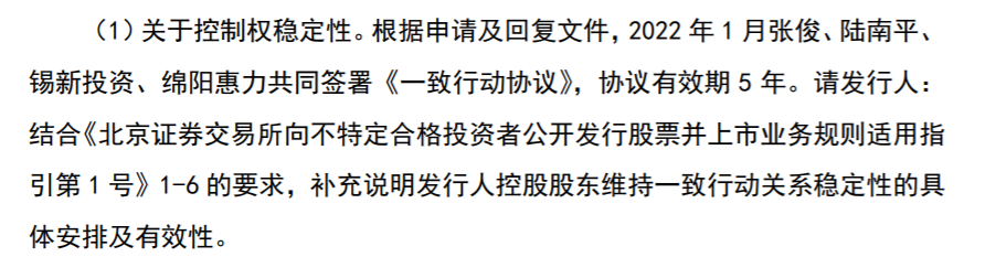 根据申请及回复文件,2022年1月张俊、陆南平、锡新投资、绵阳惠力共同签署《一致行动协议》,协议有效期5年。
