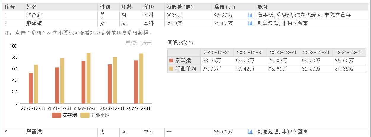 据东方财富网数据,秦翠娥现任新瀚新材副总兼董事,2024年领薪75.6万元;董事长兼总经理严留新及副总、董事严留洪同年分别领薪96.2万和75.6万元。