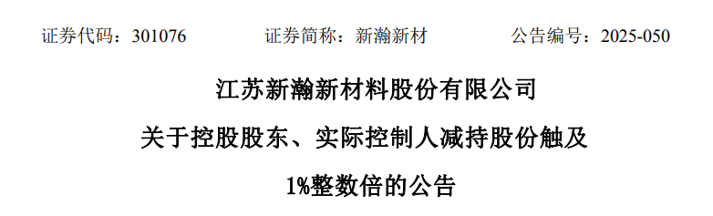 公告显示,江苏新瀚新材料股份有限公司曾于2025年9月18日披露《关于控股股东、实际控制人减持股份预披露公告》,秦翠娥拟在公告披露之日起十五个交易日后的三个月内,以集中竞价方式减持不超过174.88万股(约占公司总股本比例的1%),以大宗交易方式减持不超过174.88万股(约占公司总股本比例的1%)。