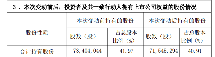 本次权益变动后,秦翠娥持有公司股份3210.48万股,持股比例由19.42%降至18.36%;秦翠娥及一致行动人严留新合计持有公司股份7154.53万股,持股比例由41.97%降至40.91%。减持后,秦翠娥直接持有公司18.36%的股份,与一致行动人严留新合计持有公司股份比例为40.91%,仍为公司控股股东、实际控制人.