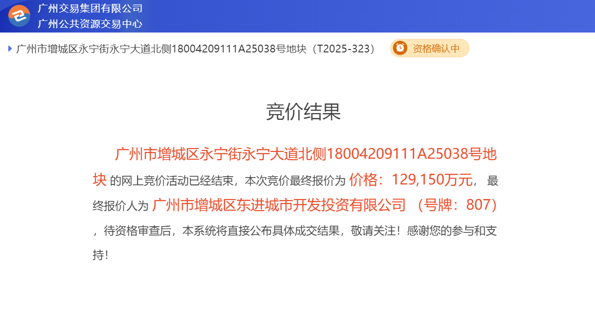 粤进深 赵盼盼 12月12日,增城城投底价拿下广州市增城区永宁街永宁大道北侧18004209111A25038号地块,成交价129150万元,楼面价5890元/㎡。