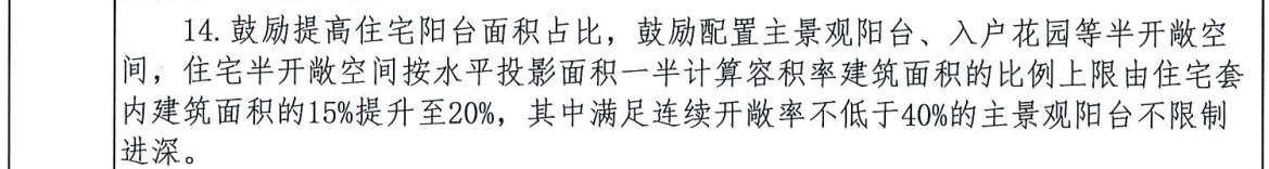 同时,鼓励提高住宅阳台面积占比,鼓励配置主景观阳台、入户花园等半开散空间,住宅半开散空间按水平投影面积一半计算容积率建筑面积的比例上限由住宅套内建筑面积的15%提升至20%,其中满足连续开散率不低于40%的主景观阳台不限制进深。