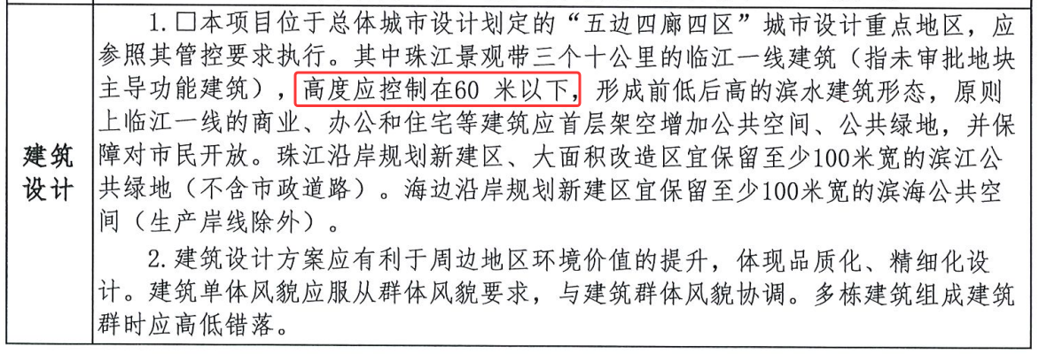 根据建筑设计要求,地块项目高度均控制在60米以下,形成前低后高的滨水建筑形态。