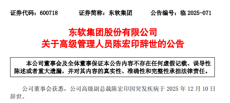 公告显示,东软集团股份有限公司董事会近日获悉公司高级副总裁陈宏印因突发疾病,于2025年12月10日辞世。陈宏印于 1996 年加入东软集团,为公司发展倾注了全部心血,并做出了重要贡献,东软集团董事会对此深表敬意和感谢,并对陈宏印的辞世表示沉痛哀悼,并向其家人致以深切慰问。