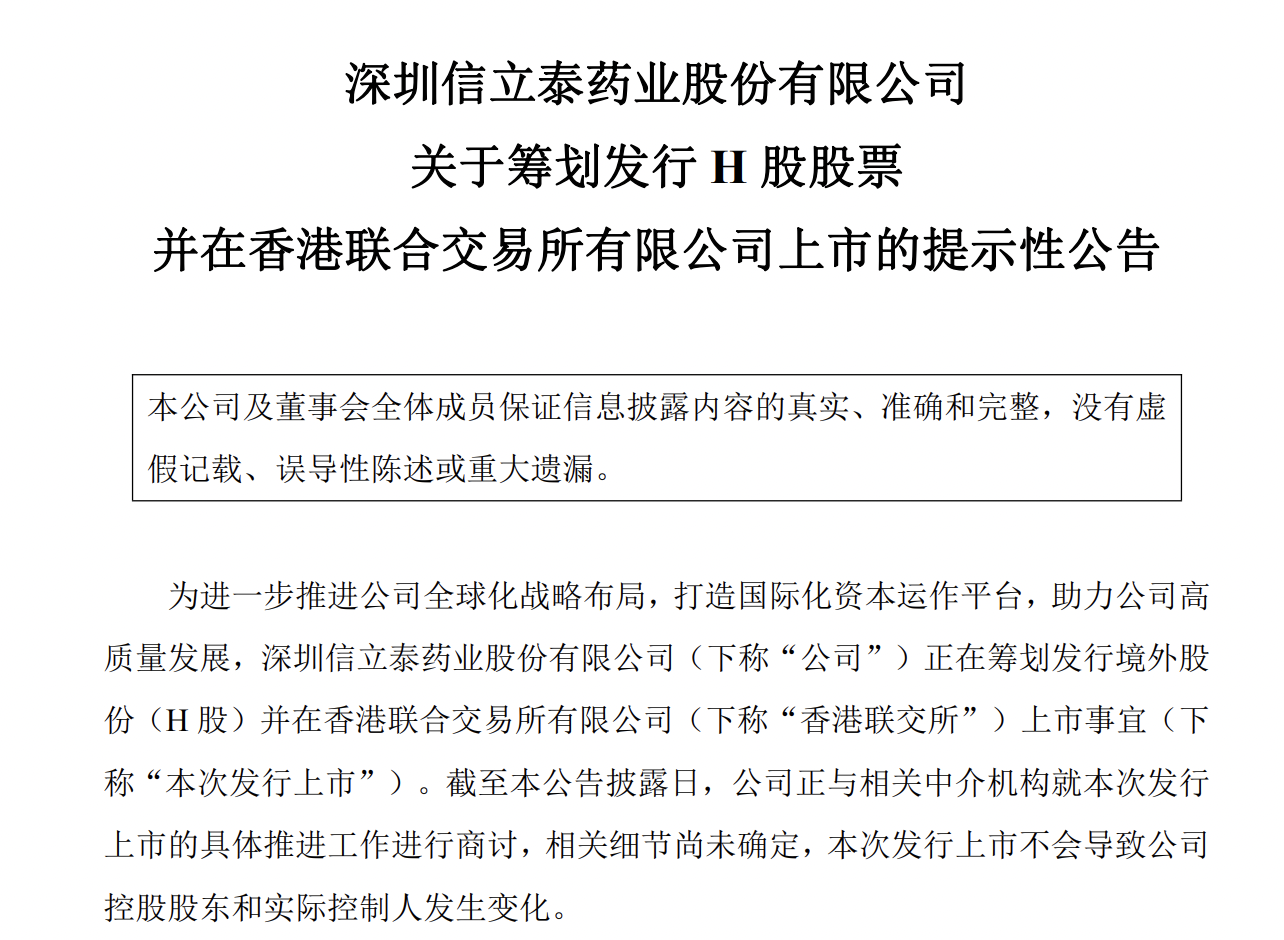 瑞财经 刘治颖 12月11日,信立泰(SZ002294)公告,为进一步推进公司全球化战略布局,打造国际化资本运作平台,助力公司高质量发展,公司正在筹划发行境外股份(H 股)并在香港联交所上市事宜。