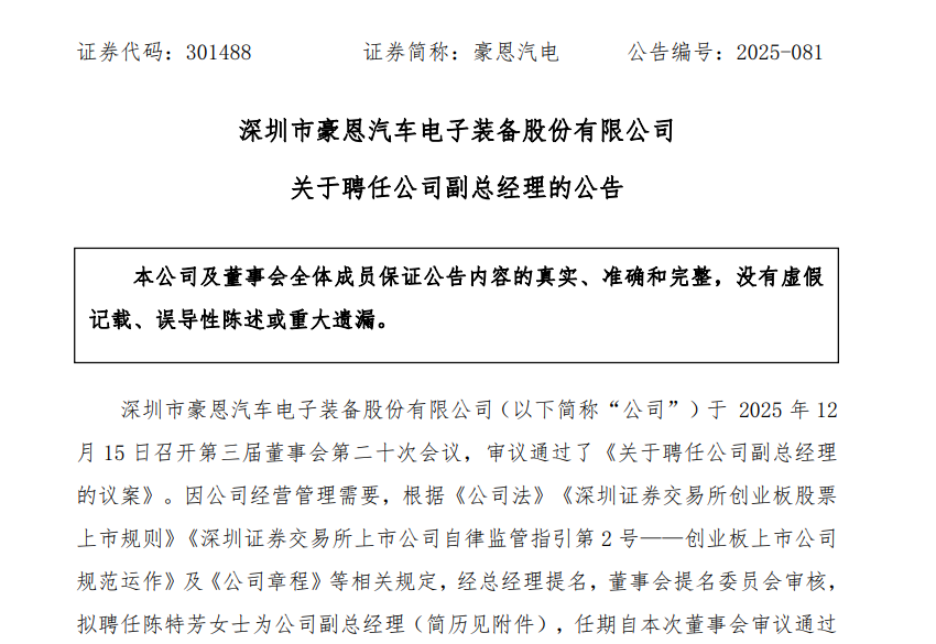 瑞财经 钟鸣辰 12月15日晚,豪恩汽电(SZ301488)发布人事公告,宣布聘任陈特芳为副总经理。