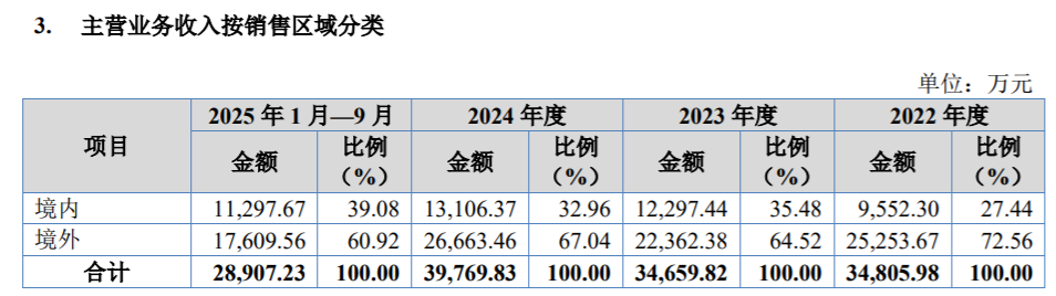 报告期内,公司境外销售收入金额分别为2.53亿元、2.24亿元、2.67亿元和1.76亿元,占主营业务收入的比例分别为72.56%、64.52%、67.04%和60.92%,占比较高,主要销售区域包括俄罗斯、加拿大、美国、英国、荷兰、瑞典等国家。
