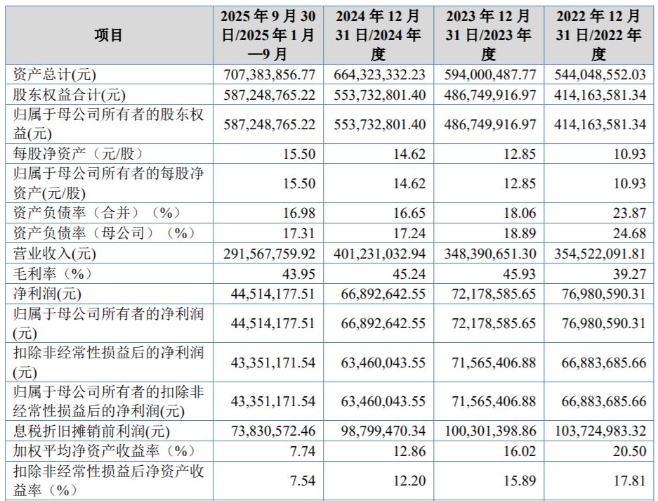 业绩方面,2022年至2024年及2025年前9个月(报告期内),公司营业收入分别为3.55亿元、3.48亿元、4.01亿元和2.92亿元;综合毛利率分别为39.27%、45.93%、45.24%和43.95%;归属于母公司所有者的净利润分别为0.77亿元、0.72亿元、0.67亿元及0.45亿元。