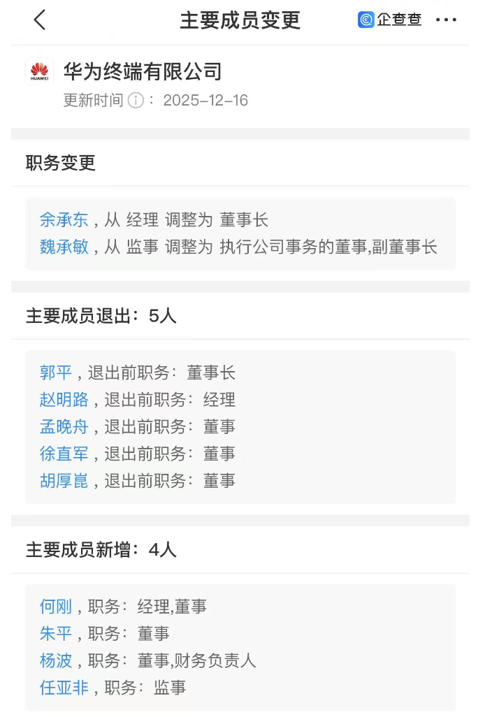 其中,郭平卸任董事长,由余承东接任,孟晚舟、徐直军等卸任董事,另有多位高管发生变更。