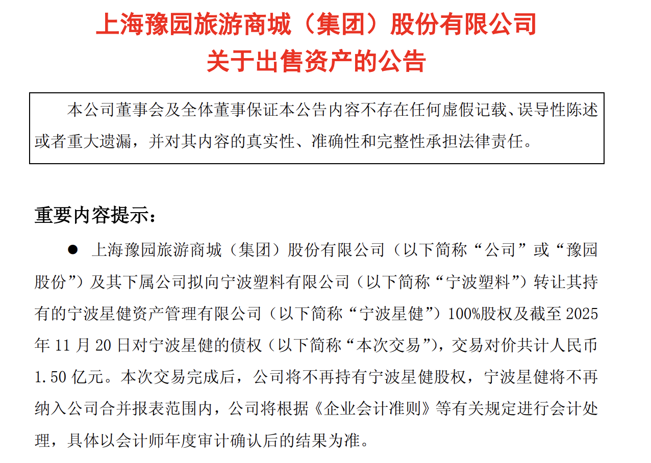 乐居财经 张林霞 近日,豫园股份(SH600655)发布关于出售资产的公告。
