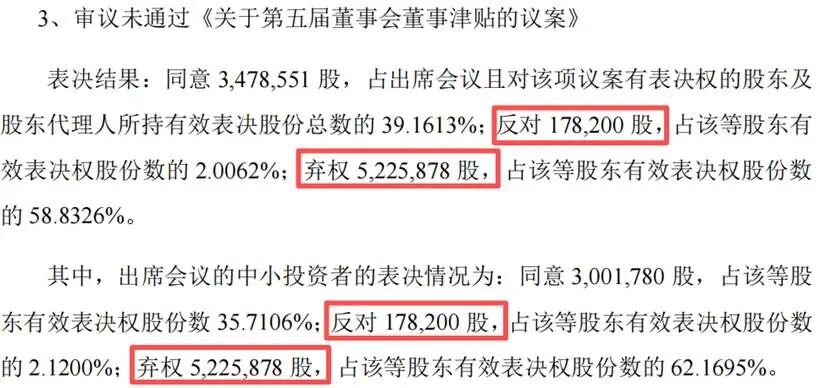 也就是说,对于董事津贴议案的表决,投下反对票、弃权票的,都是中小投资者。