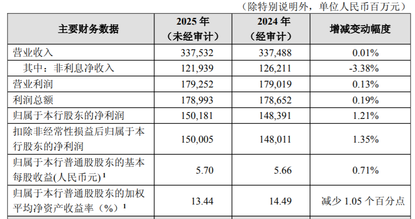 2025年,招商银行实现营业收入3375.32亿元,同比增加0.44亿元,增幅0.01%;利润总额1789.93亿元,同比增加3.41亿元,增幅0.19%;归属于该行股东的净利润1501.81亿元,同比增加17.9亿元,增幅1.21%。