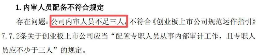 2013年5月,上海证监局对该公司进行现场检查,指出其内审人员不足三人,不符合创业板上市公司“配置专职人员从事内部审计工作,且专职人员应不少于三人”的规定。
