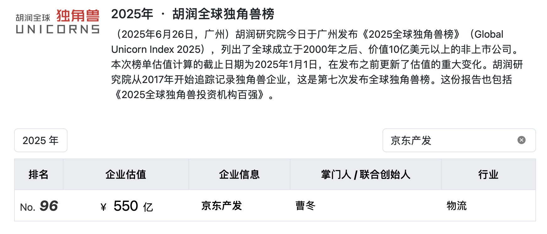 据《2025年胡润全球独角兽榜》,京东产发估值550亿,排名第96。