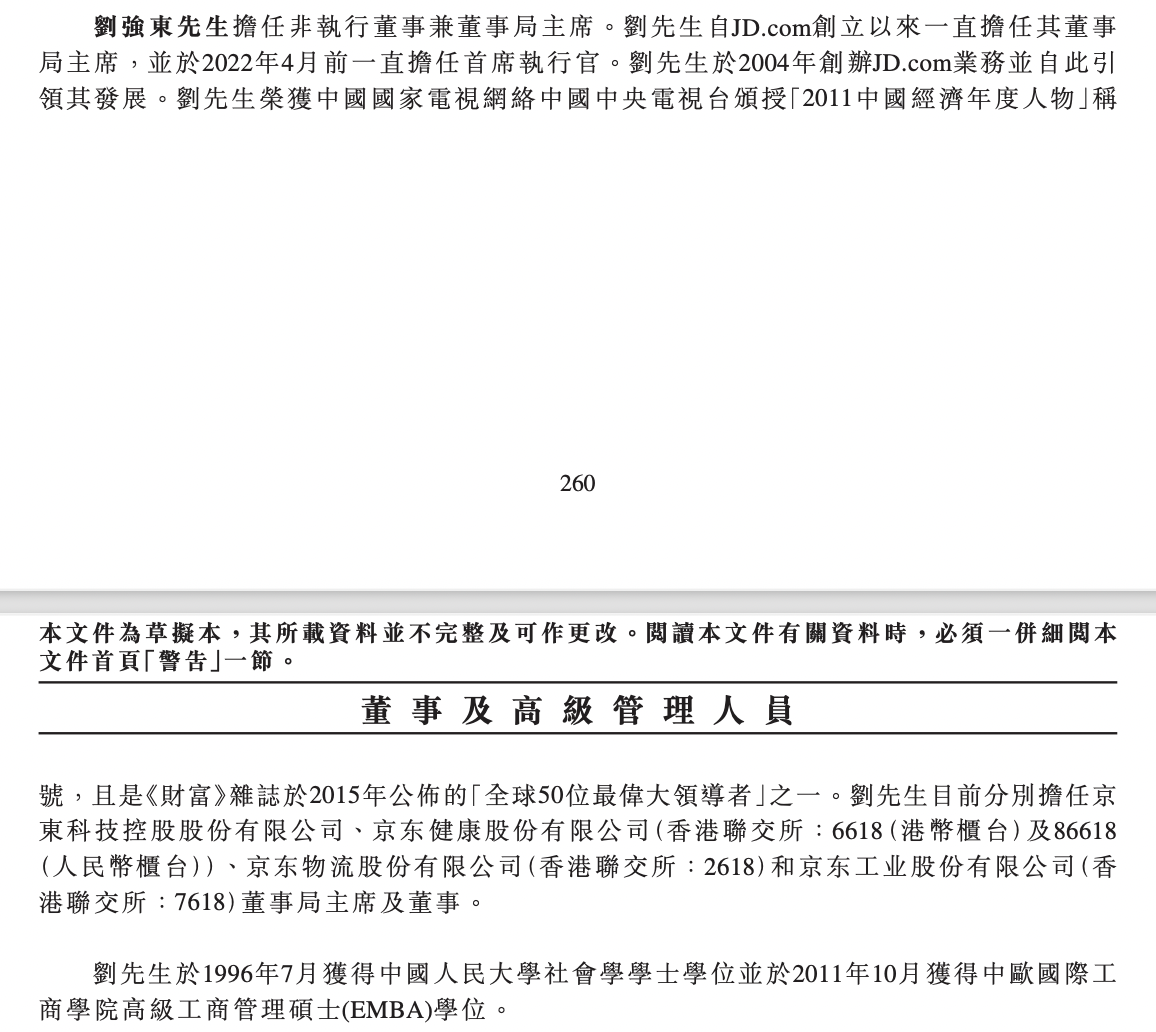 资料显示,刘强东担任非执行董事兼董事局主席。刘强东自JD.com创立以来一直担任其董事局主席,并于2022年4月前一直担任首席执行官。刘强东于2004年创办JD.com业务并自此引领其发展。刘强东荣获中国国家电视网络中国中央电视台颁授“2011中国经济年度人物”称号,且是《财富》杂志于2015年公布的“全球50位最伟大领导者”之一。刘强东目前分别担任京东科技控股股份有限公司、京东健康股份有限公司、京东物流股份有限公司和京东工业股份有限公司董事局主席及董事。