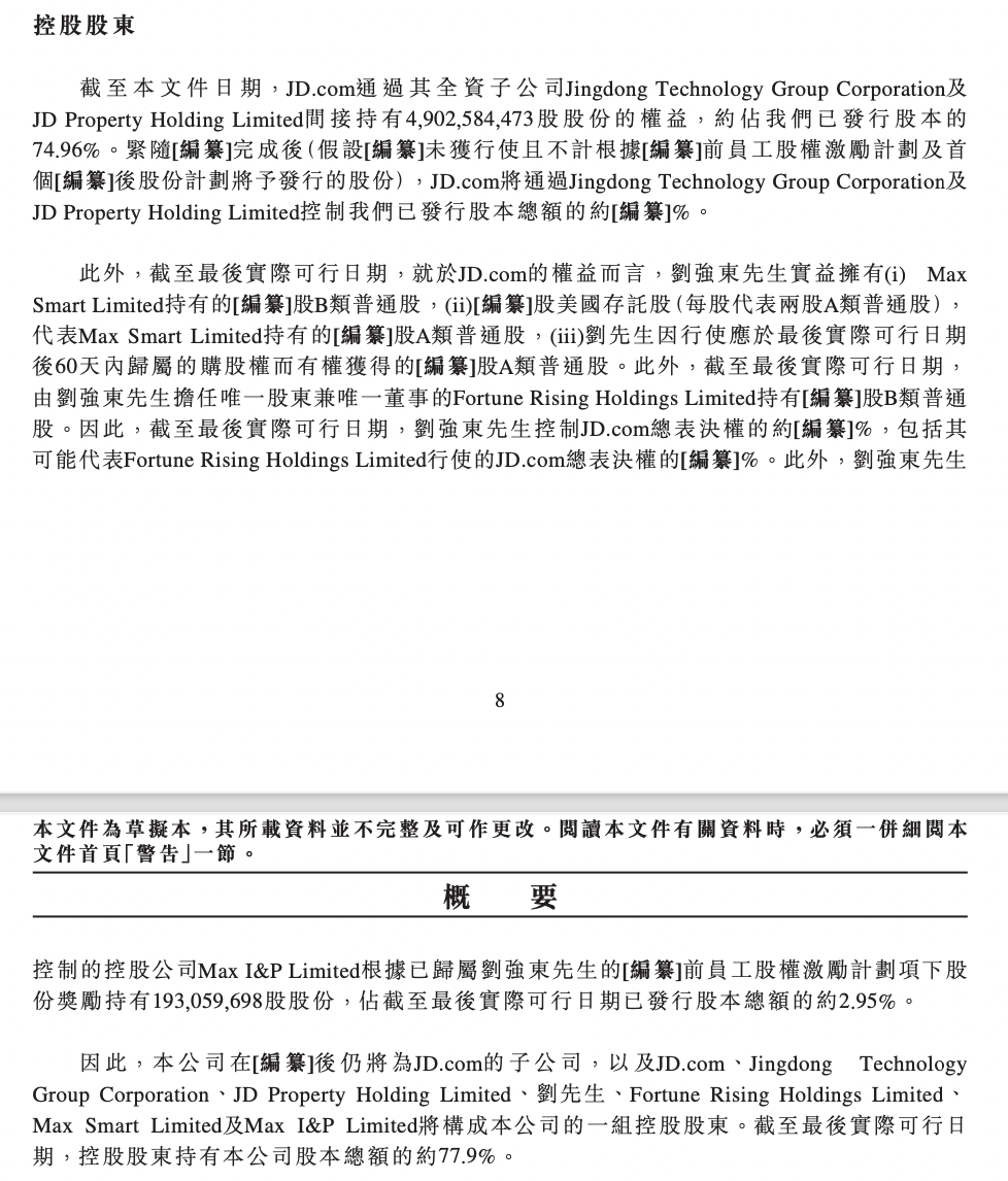 IPO前,京东集团(JD.com)通过其全资子公司Jingdong Technology Group Corporation及JD Property Holding Limited间接持有4,902,584,473股股份的权益,约占公司已发行股本的74.96%。