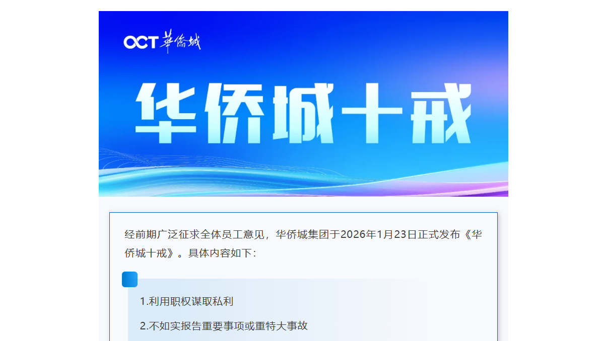 乐居财经 李兰 1月27日,华侨城集团通过其官微“创想华侨城”正式发布《华侨城十戒》。该文件旨在明确了各级管理人员的禁止行为,强化内部监管。