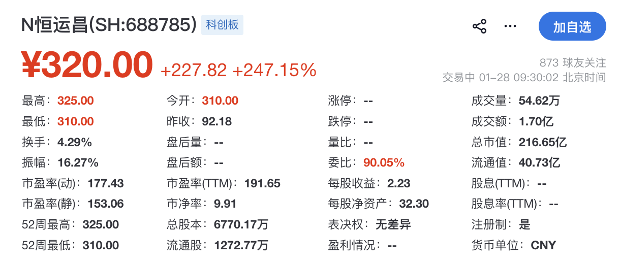 乐居财经 刘治颖 1月28日,恒运昌(688785.SH)在上交所科创板挂牌上市,保荐机构中信证券,开盘涨247.15%,总市值216.65亿元。