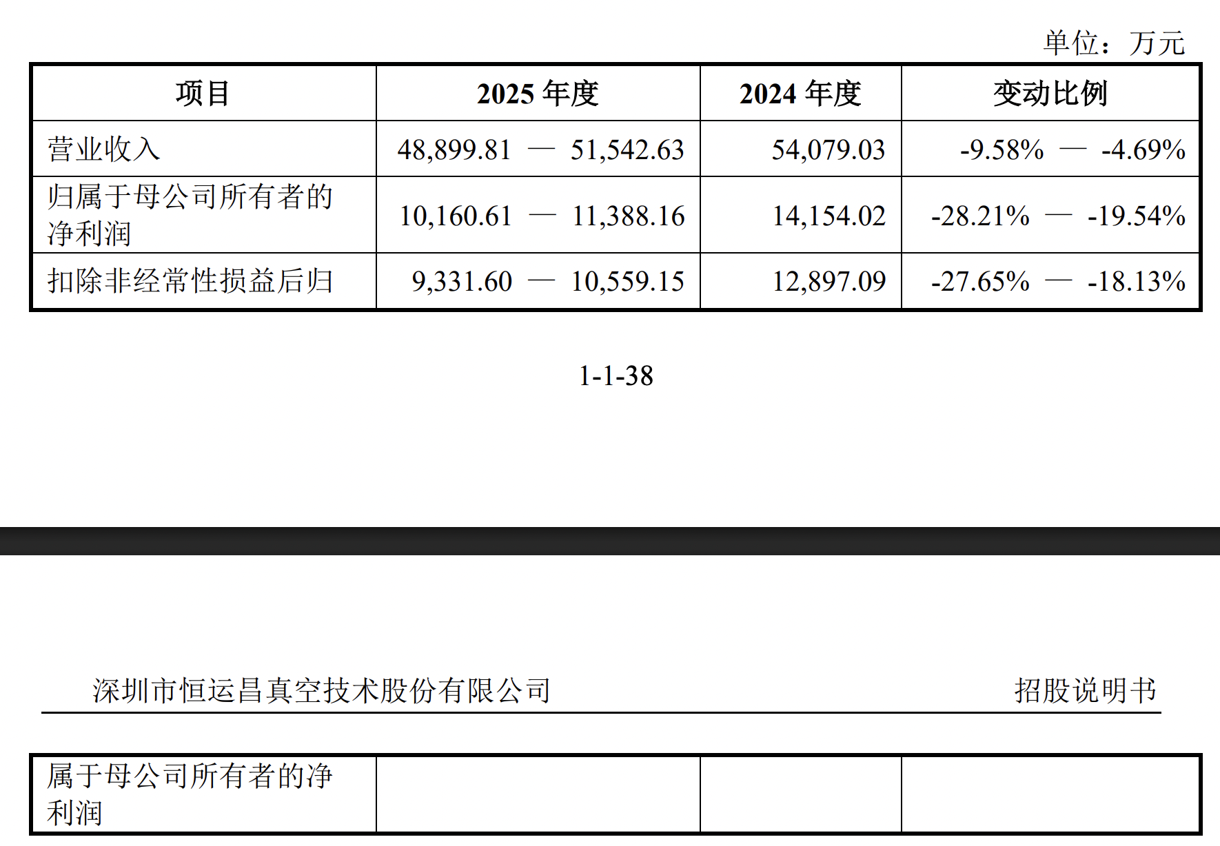 2025年,恒运昌预计营业收入为4.89亿元-5.15亿元,同比减少4.69%-9.58%;归属于母公司所有者的净利润1.02亿元-1.14亿元,同比减少19.54%-28.21%。
