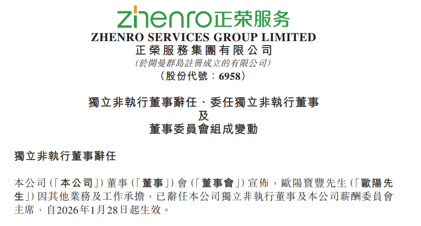乐居财经 李兰 1月28日,正荣服务(06958.HK)发布公告,宣布公司独立非执行董事及薪酬委员会主席发生变动。