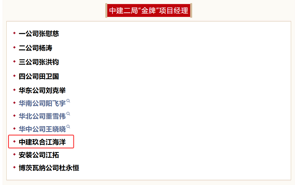 1月21日,中建二局发布表彰名单。其中,江海洋荣获中建二局“金牌”项目经理。