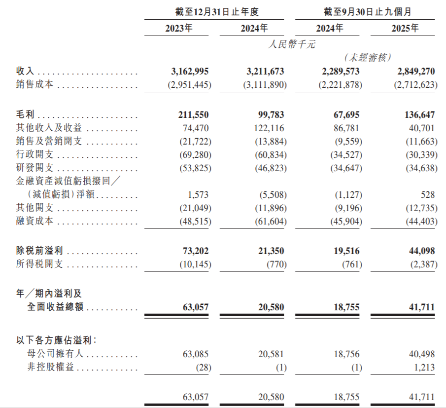业绩方面,于2023年、2024年及2025年截至9月30日止九个月,铜博科技收入分别约为31.63亿元、32.12亿元、28.49亿元;溢利及全面收益总额分别为6305.7万元、2058万元、4171.1万元。