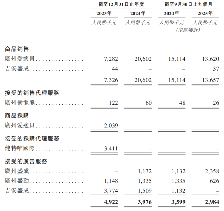 期内,公司向广州爱迪贝销售产品金额分别为728.2万元、2060.2万元及1362万元,占各期收入比重分别为1.2%、2.4%及1.75%。2024年及2025年前9个月,广州爱迪贝为公司前五大客户之一。