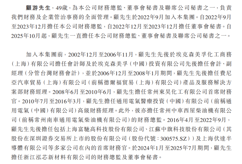 此外,顾游亦担任常州中车西屋柴油机有限公司(前称常州南车通用电气柴油机有限公司)的财务总监;2016年4月至2022年9月,先后担任包括上海富驰高科技股份有限公司、江苏中旗科技股份有限公司及上海伏达半导体有限公司等多家公司在内的首席财务官;于2024年1月至2025年7月期间,担任浙江泓芯新材料有限公司的财务总监及董事会秘书。