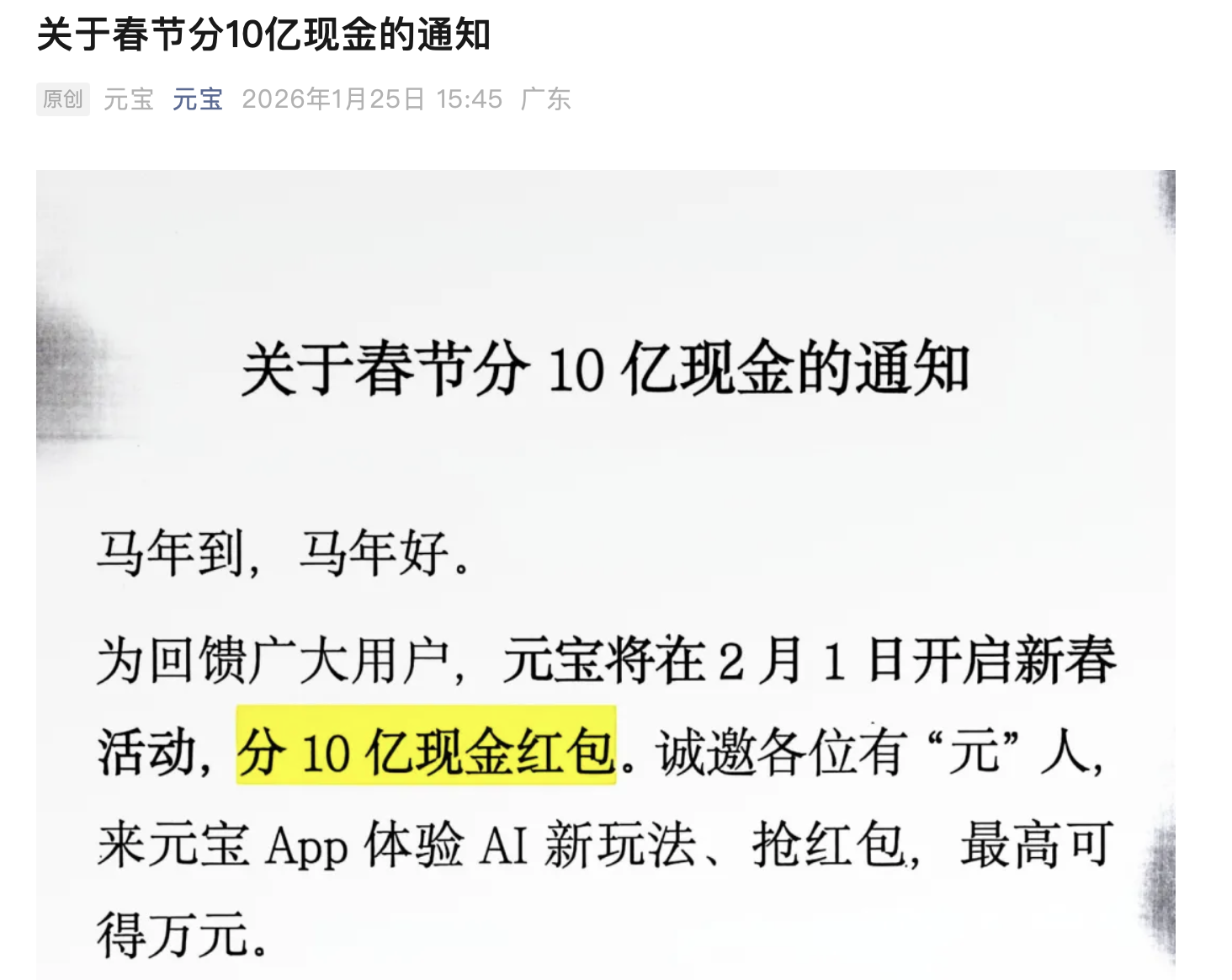 今年1月25日,腾讯元宝发布《关于春节分10亿现金的通知》。通知显示,为回馈广大用户,元宝将在2月1日开启新春活动,分10亿元现金红包,单个红包金额可达万元,引发广泛关注。