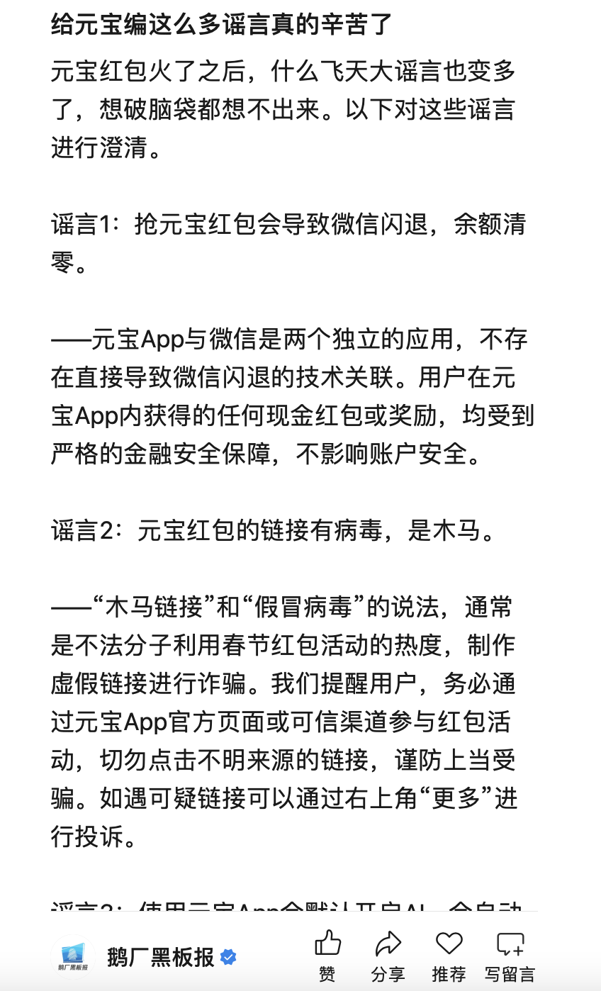 2月4日,腾讯官方账号“鹅厂黑板报”发文,就涉元宝App相关谣言进行澄清。