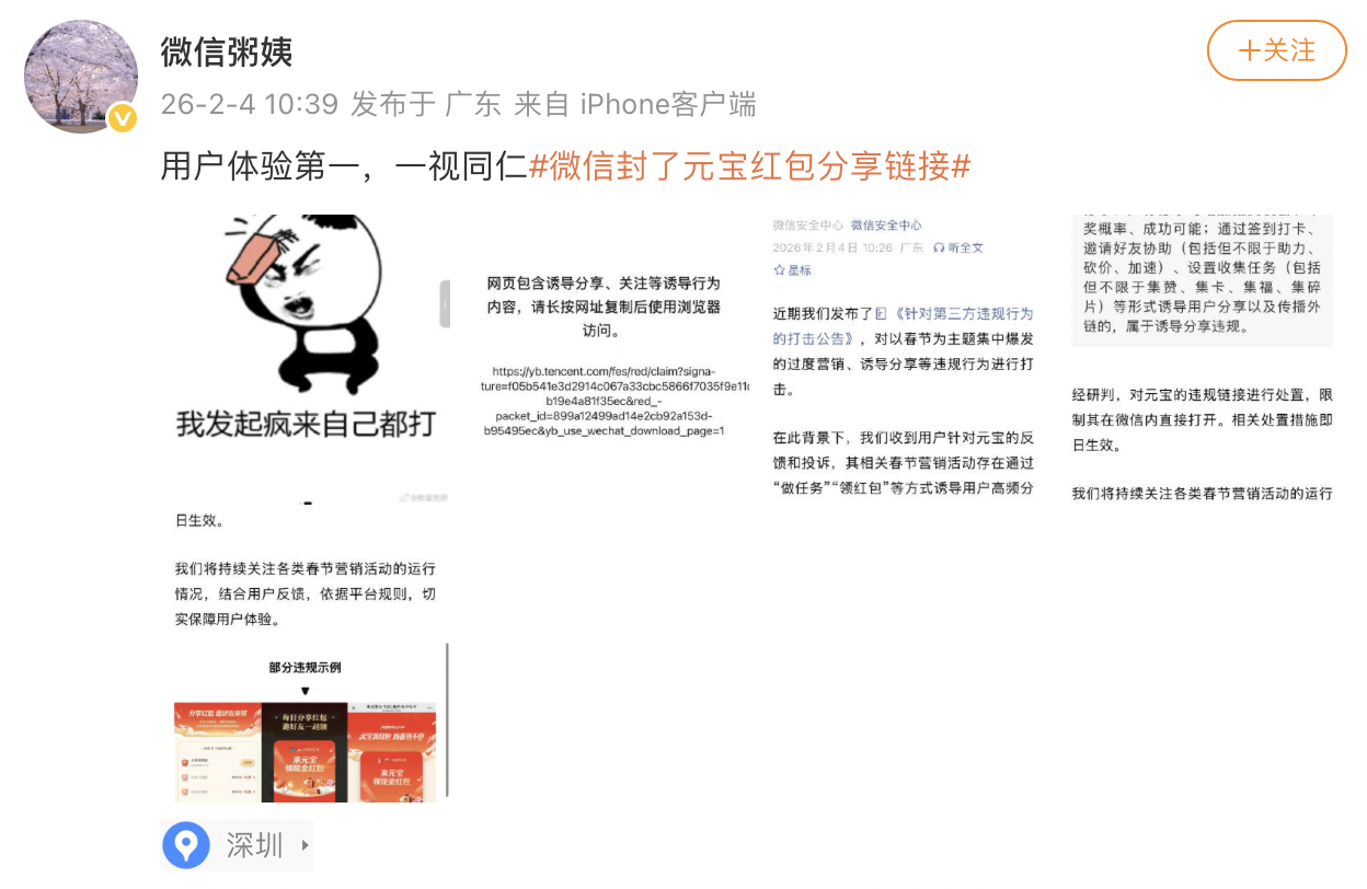 据其指出,收到用户针对元宝的反馈和投诉,其相关春节营销活动存在通过“做任务”“领红包”等方式诱导用户高频分享链接到微信群等场景,干扰平台生态秩序、影响用户体验、对用户造成骚扰。
