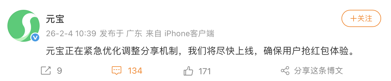 瑞财经 吴文婷 2月4日,被微信限制分享后,元宝回应称:“正在紧急优化调整分享机制,我们将尽快上线,确保用户抢红包体验。”