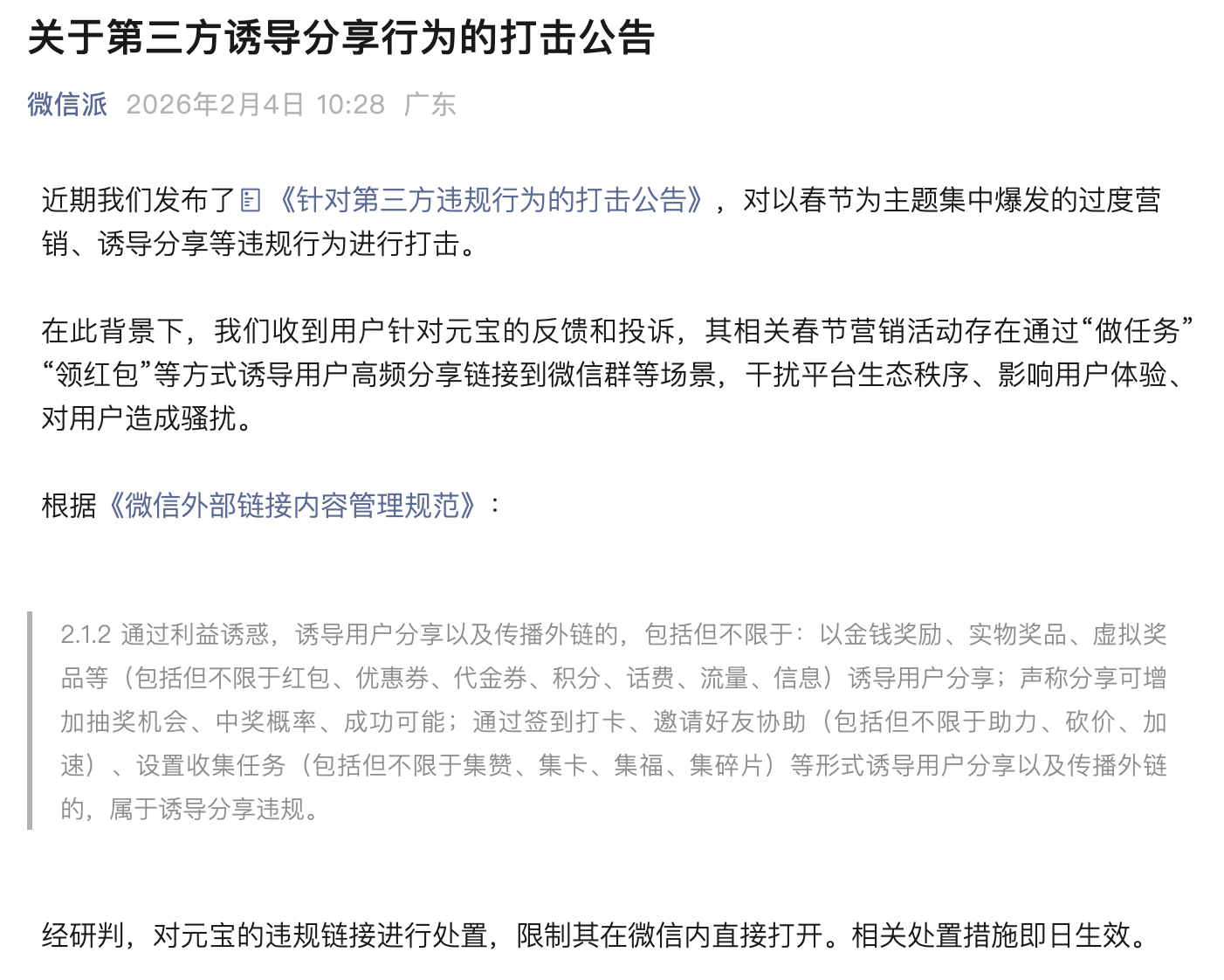 经研判,对元宝的违规链接进行处置,限制其在微信内直接打开。相关处置措施即日生效。