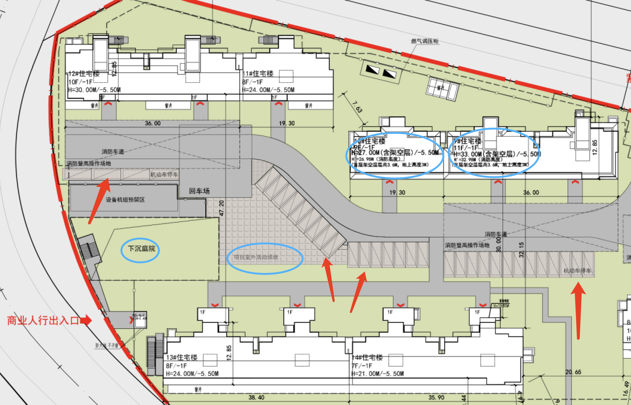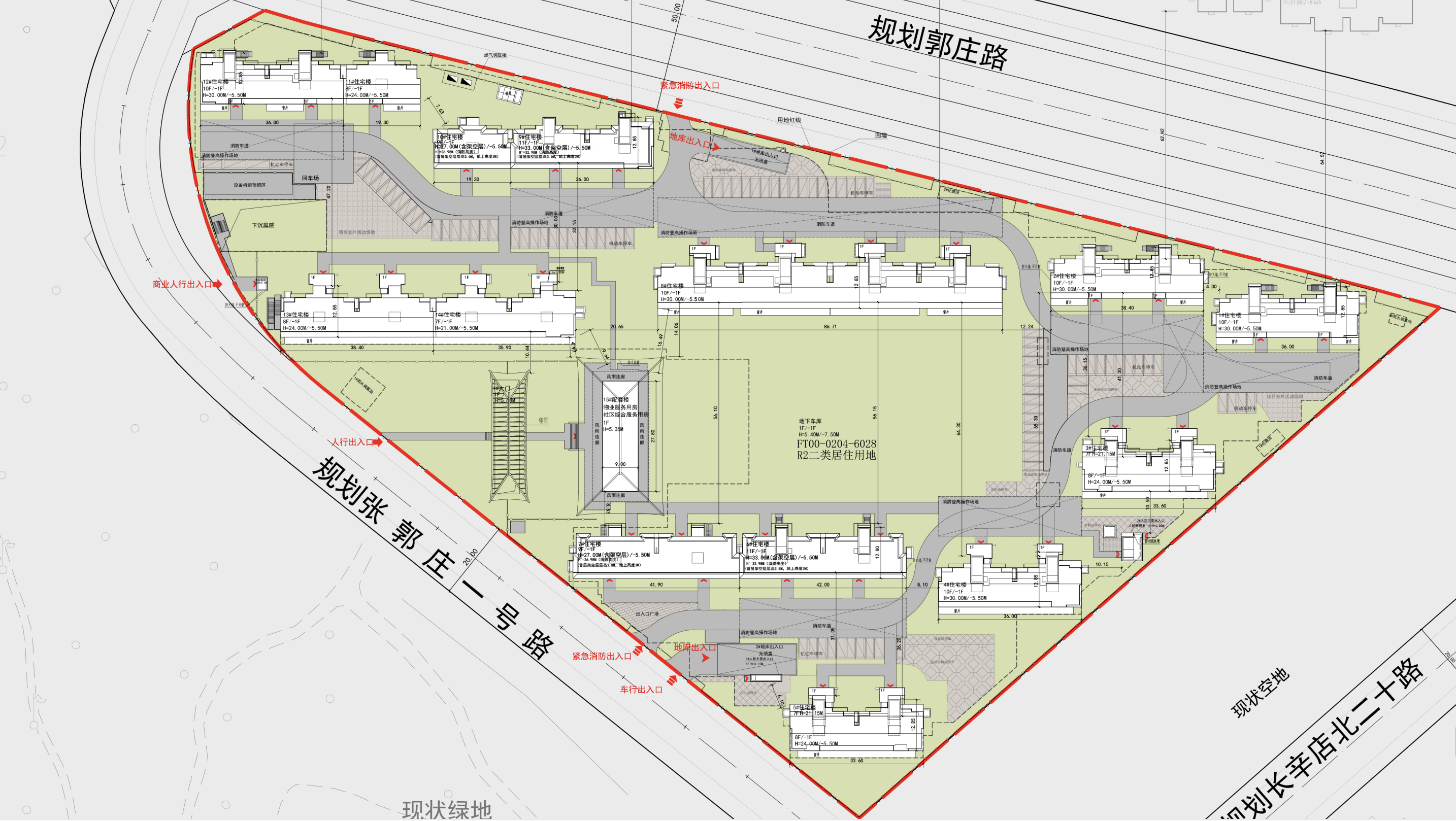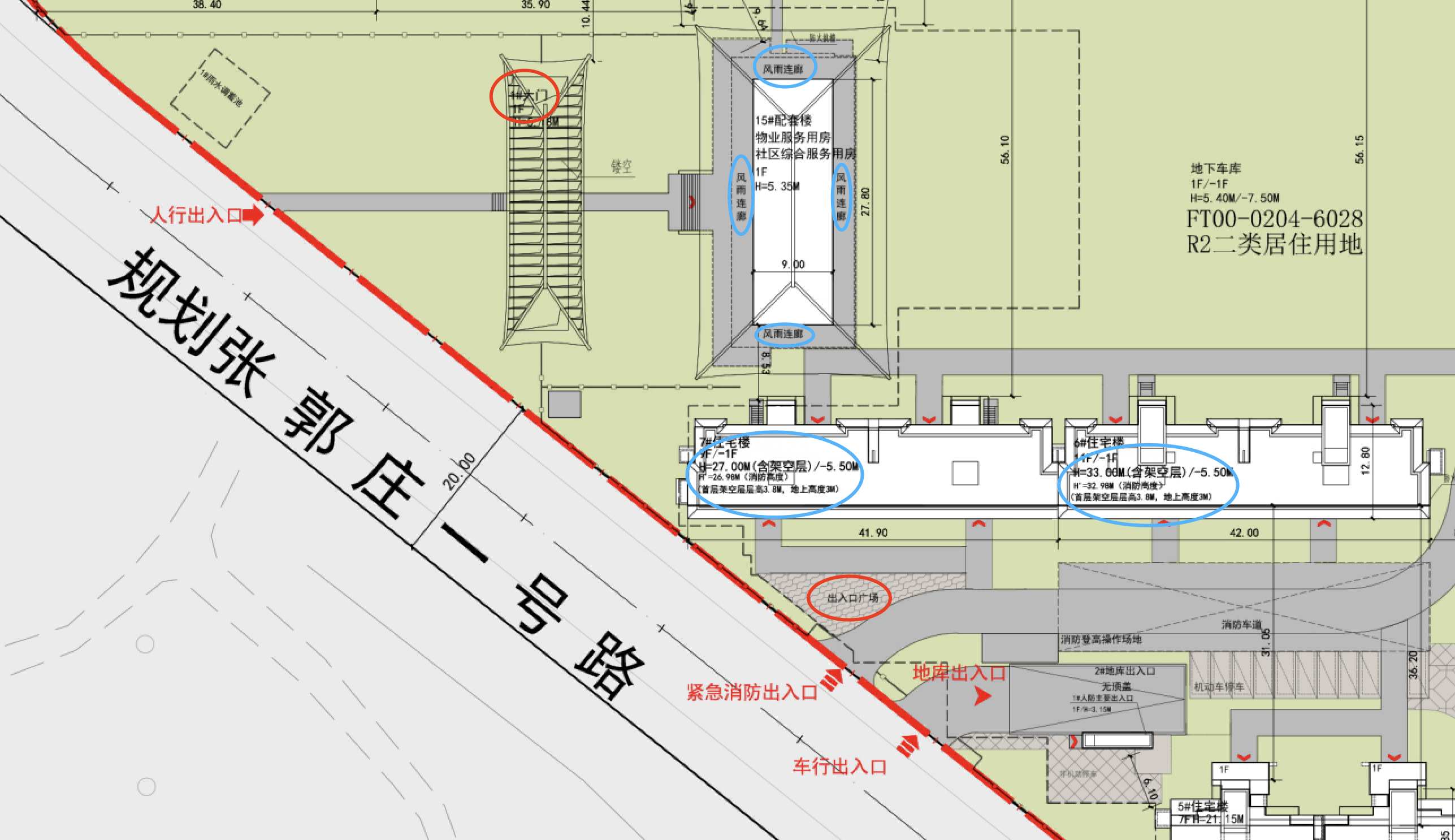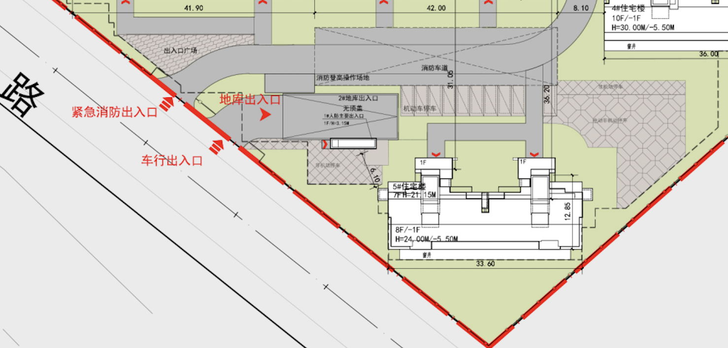 小区南北各有一处地库出入口,与消防通道共用出入口,而南侧出入口特别标记了“车行出入口”,且设置有出入口广场、非机动停车位。