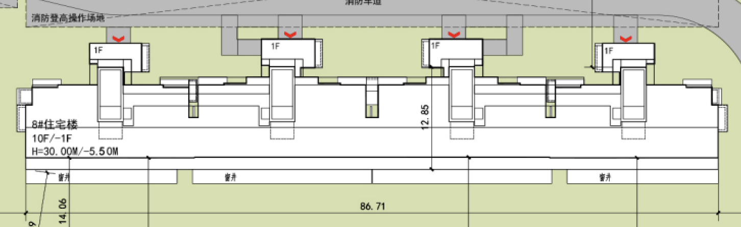 此外,除了4栋首层设置架空的楼栋,其余住宅楼南侧均有大面积窗井,考虑首层下跃户型。