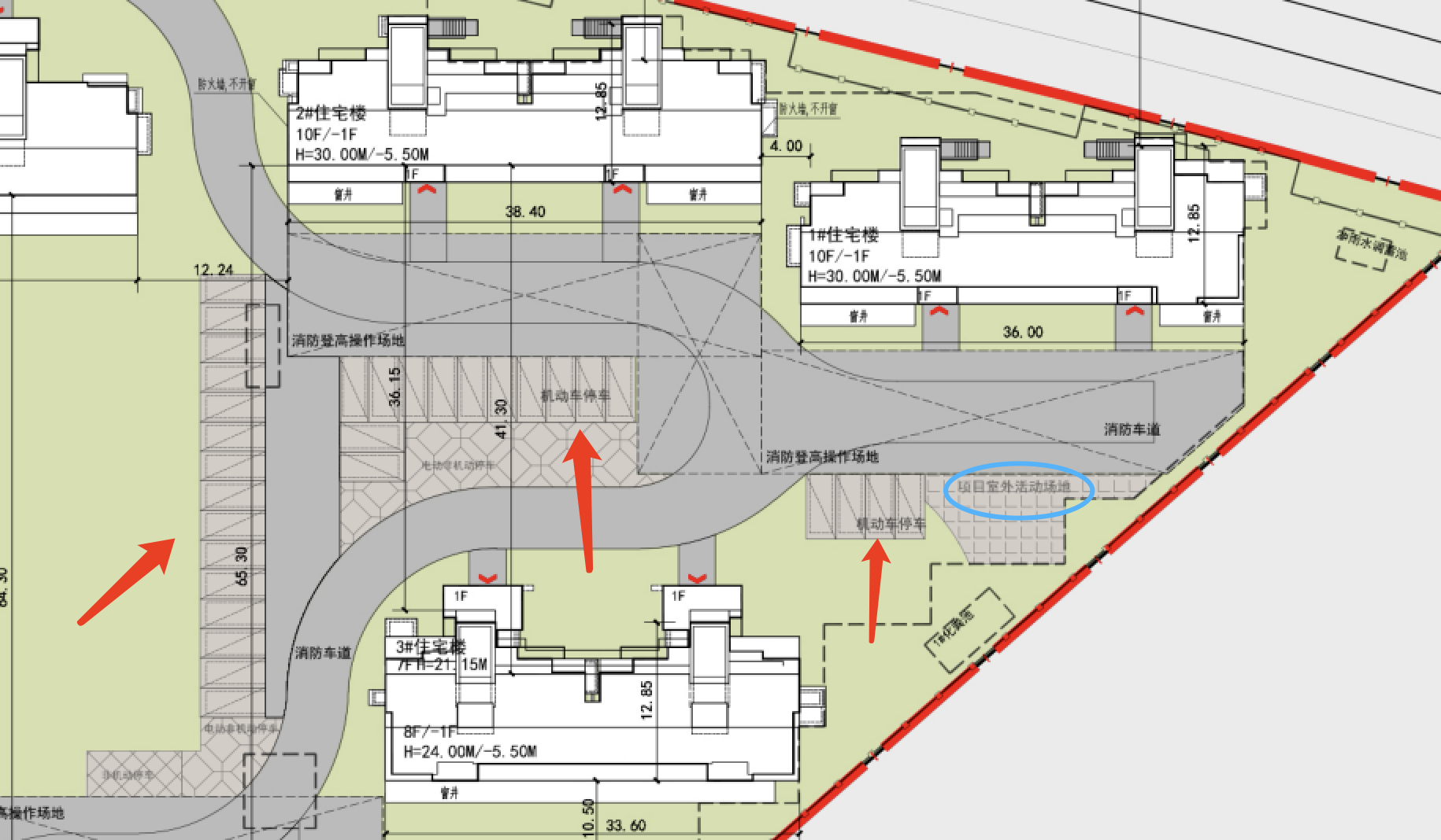 分布在消防车道周围,除了大门和中央景轴的位置,其它楼栋底下都有停车位。