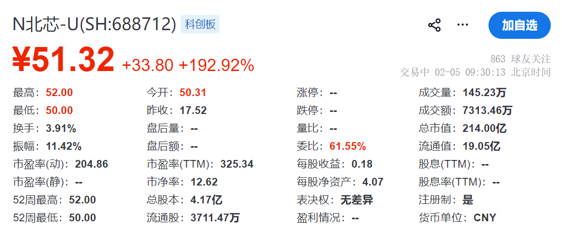 乐居财经 王敏 2月5日,北芯生命-U(SH:688712)在科创板挂牌上市,保荐机构为中金公司。其开盘涨193%,总市值214亿元。