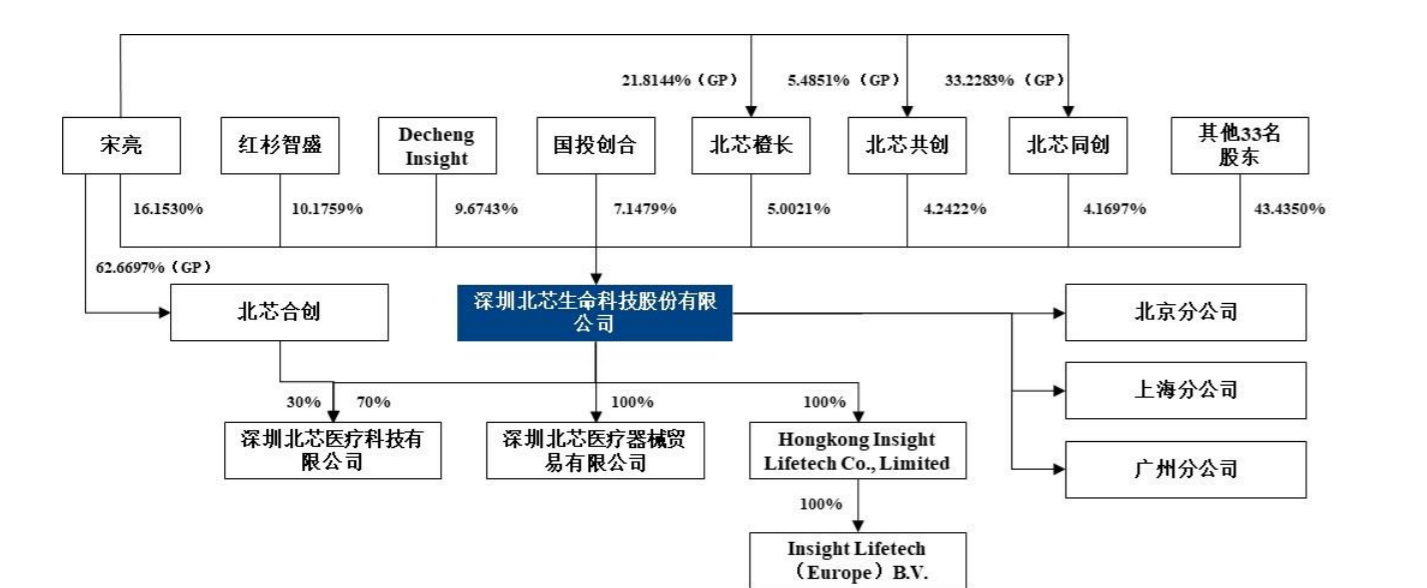 截至2025年9月30日,本次发行前,公司整体股权结构较为分散,公司实际控制人宋亮的持股比例较低,直接持有公司16.1530%的股份。除自身直接持有公司股份外,宋亮通过担任公司员工持股平台北芯共创、北芯橙长及北芯同创的执行事务合伙人控制公司13.4140%的股份,宋亮自身及通过其控制的员工持股平台合计控制公司29.5670%的股份。公司第二至第四大股东红杉智盛、Decheng Insight、国投创合分别持有公司10.1759%、9.6743%及7.1479%的股份。