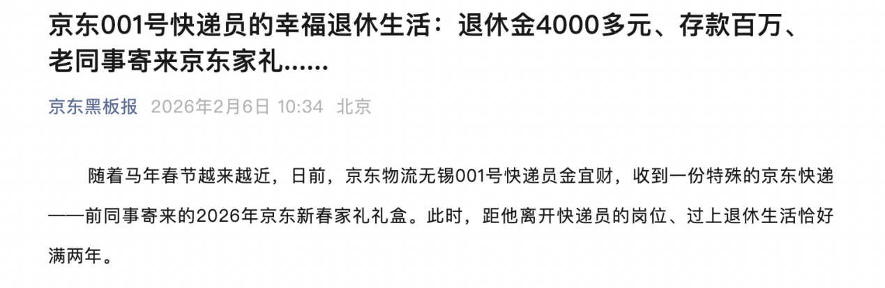 瑞财经 刘治颖2月6日,据京东黑板报消息,京东物流无锡001号快递员金宜财退休已满两年。退休后的生活,金宜财过得充实富足,每月4000多元养老金准时到账,还靠着打拼积攒下的积蓄和理财存到了一百多万,“房子不缺,车也有了,就是浑身还有使不完的劲”。