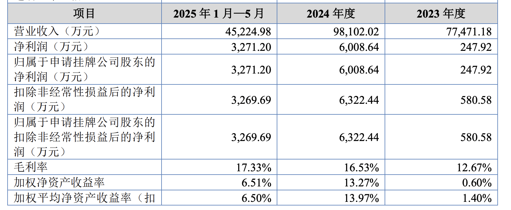 2023年、2024年及2025年前5月,永志股份营业收入分别为7.75亿元、9.81亿元、4.52亿元,净利润分别为247.92万元、6008.64万元、3271.20万元;毛利率分别为12.67%、16.53%、17.33%。