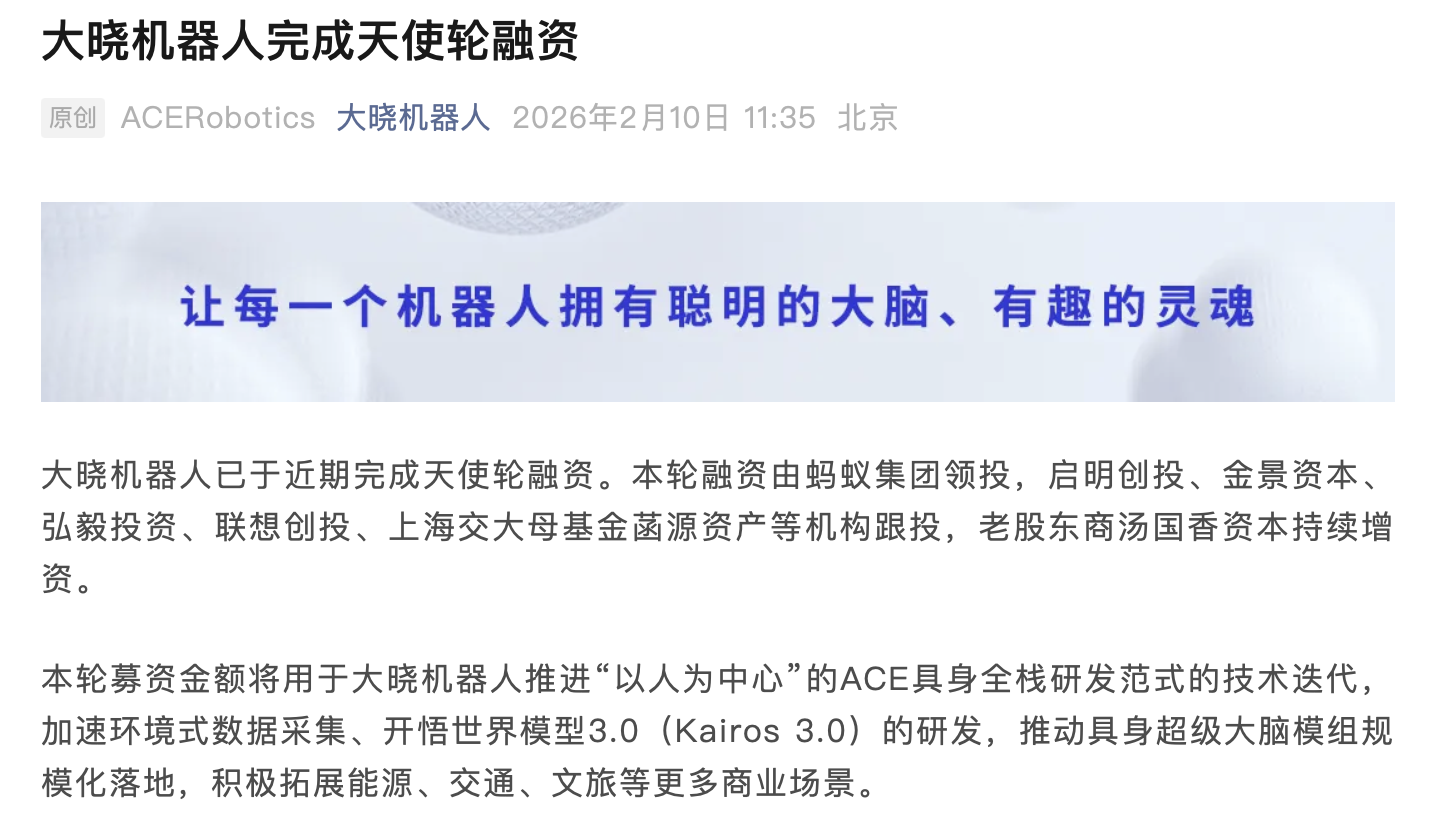 瑞财经 吴文婷 2月10日,大晓机器人已于近期完成天使轮融资。本轮融资由蚂蚁集团领投,启明创投、金景资本、弘毅投资、联想创投、上海交大母基金菡源资产等机构跟投,老股东商汤国香资本持续增资。